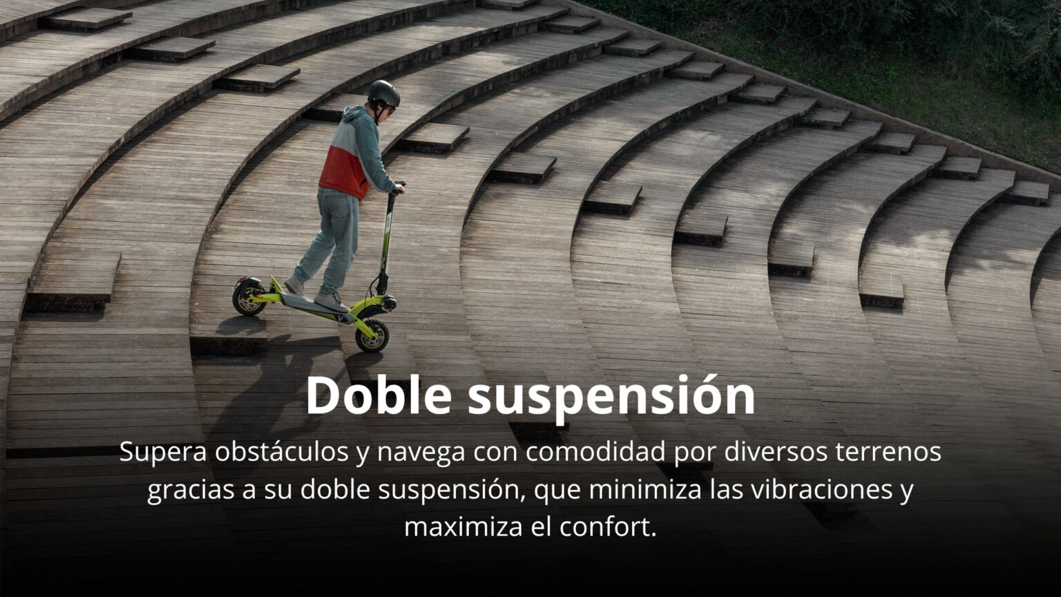 - Conducción cómoda y estable en cualquier superficie. La avanzada doble suspensión asegura una experiencia de conducción suave y confortable, absorbiendo los desniveles del terreno y proporcionando estabilidad en todo momento.