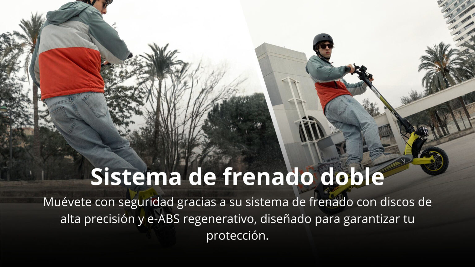 - Frenado seguro y eficaz. El sistema de frenado doble con discos de alta precisión y e-ABS regenerativo permite paradas rápidas y seguras, garantizando tu protección en cualquier situación.